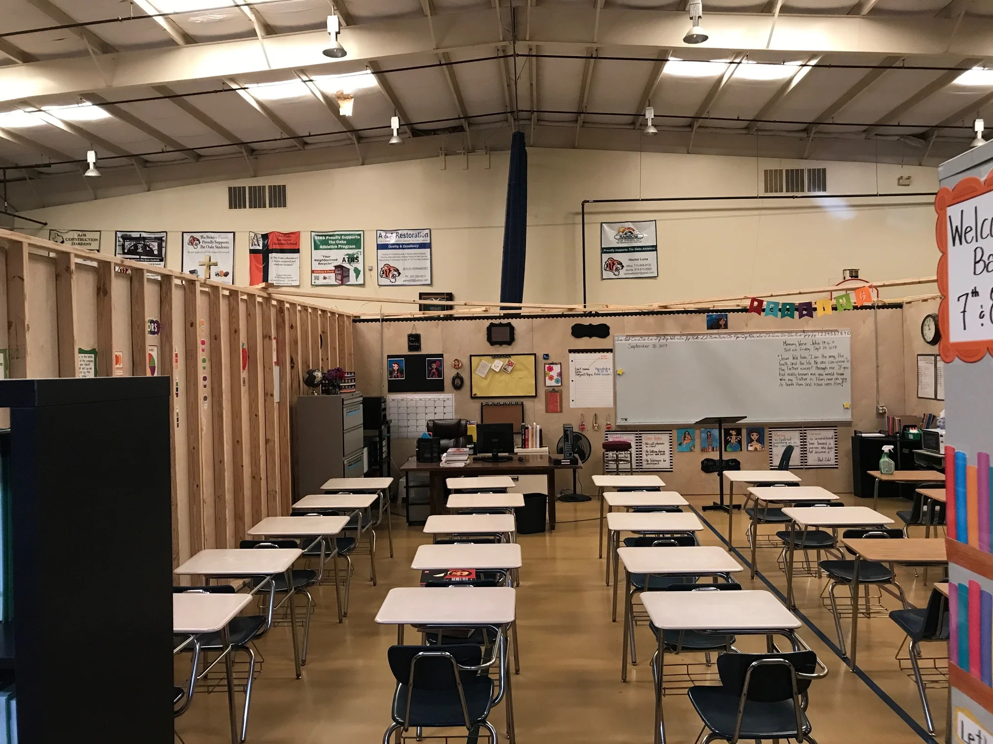 Temporary partitions were erected in the Oaks' gymnasium to allow classes to resume.